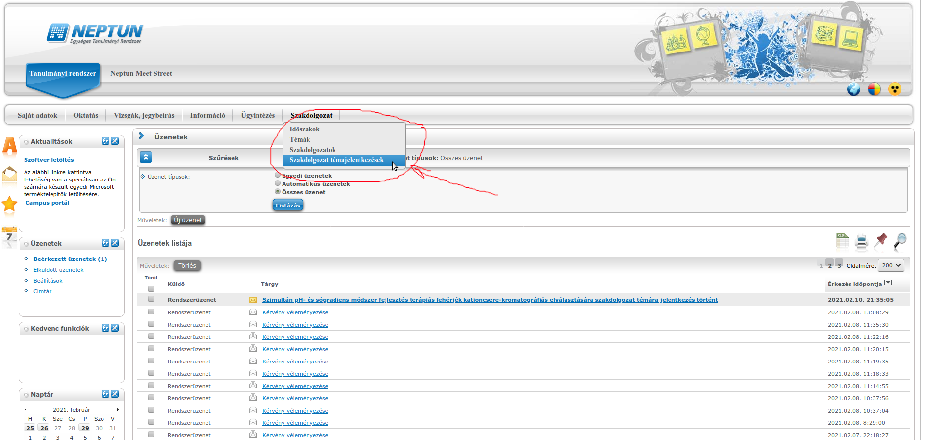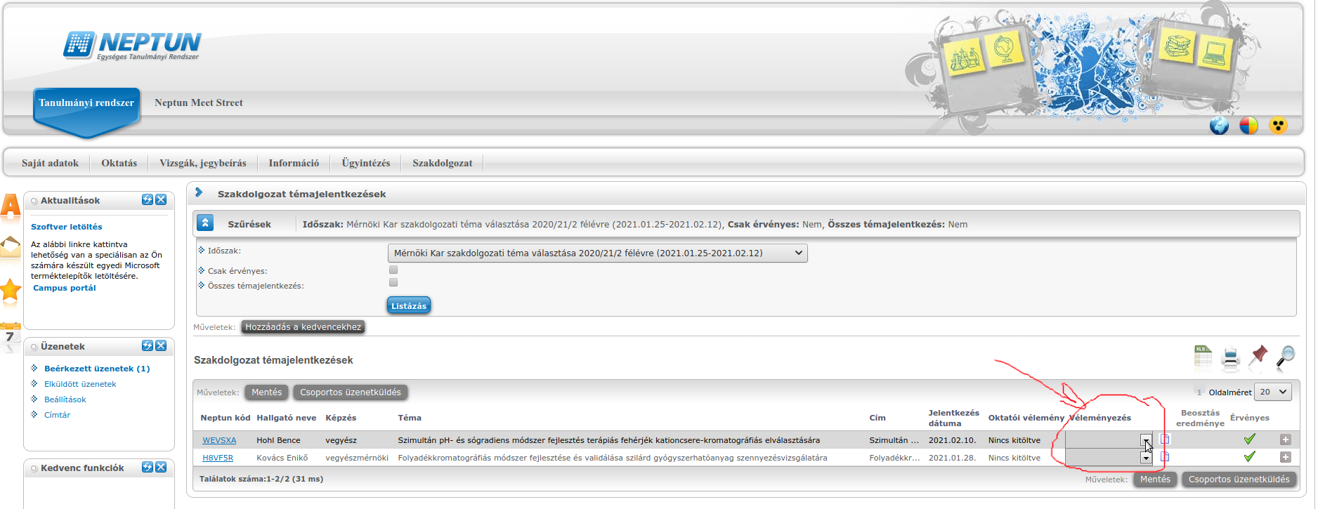 Kedves Kollégák! Ezúton továbbítom Dr. Horváth Krisztián dékánhelyettes levelét az oktató kollégák számára mely fontos információkat tartalmazhat. Üdvözlettel: -- -------- Továbbított üzenet -------- Tárgy: Aktuális oktatási feladatok Dátum: Tue, 16 Feb 2021 09:41:35 +0100 Feladó: Krisztian Horvath <okt.dh@mk.uni-pannon.hu> Válaszcím: okt.dh@mk.uni-pannon.hu Kedves Kollégák! Ezen a héten van lehetőség a szakdolgozati jelentkezések elfogadására. Erre a Neptunban van lehetőségük a "Szakdolgozat/Szakdolgozat témajelentkezések" menüpont alatt (1.png). Az így megnyíló oldalon láthatják a hallgatói jelentkezéseket, melyeket a "Véleményezés" oszlop értelemszerű kitöltésével tudnak támogatni vagy elutasítani (2.png). Fontos, hogy a végén mentsék el a véleményüket (hasonlóan, mint a jegybeírásnál). Több hallgató jelezte, hogy nem kaptak információt a kurzusok lebonyolításának menetéről, helyéről (pl. elearning link). Nyomatékosan kérek minden oktató kollégát, hogy Neptun üzenetben mielőbb értesítsék erről a hallgatókat. Kérem, juttassák el a fenti információkat a kutatócsoportjuk tagjainak. Szíves közreműködésüket előre is köszönöm. Üdvözlettel -- *Horváth Krisztián* /oktatási és akkreditációs dékánhelyettes/ Pannon Egyetem Mérnöki Kar 8200 Veszprém, Egyetem u. 10. Tel.: (88) 624000/6092 okt.dh@mk.uni-pannon.hu <mailto:okt.dh@mk.uni-pannon.hu>
