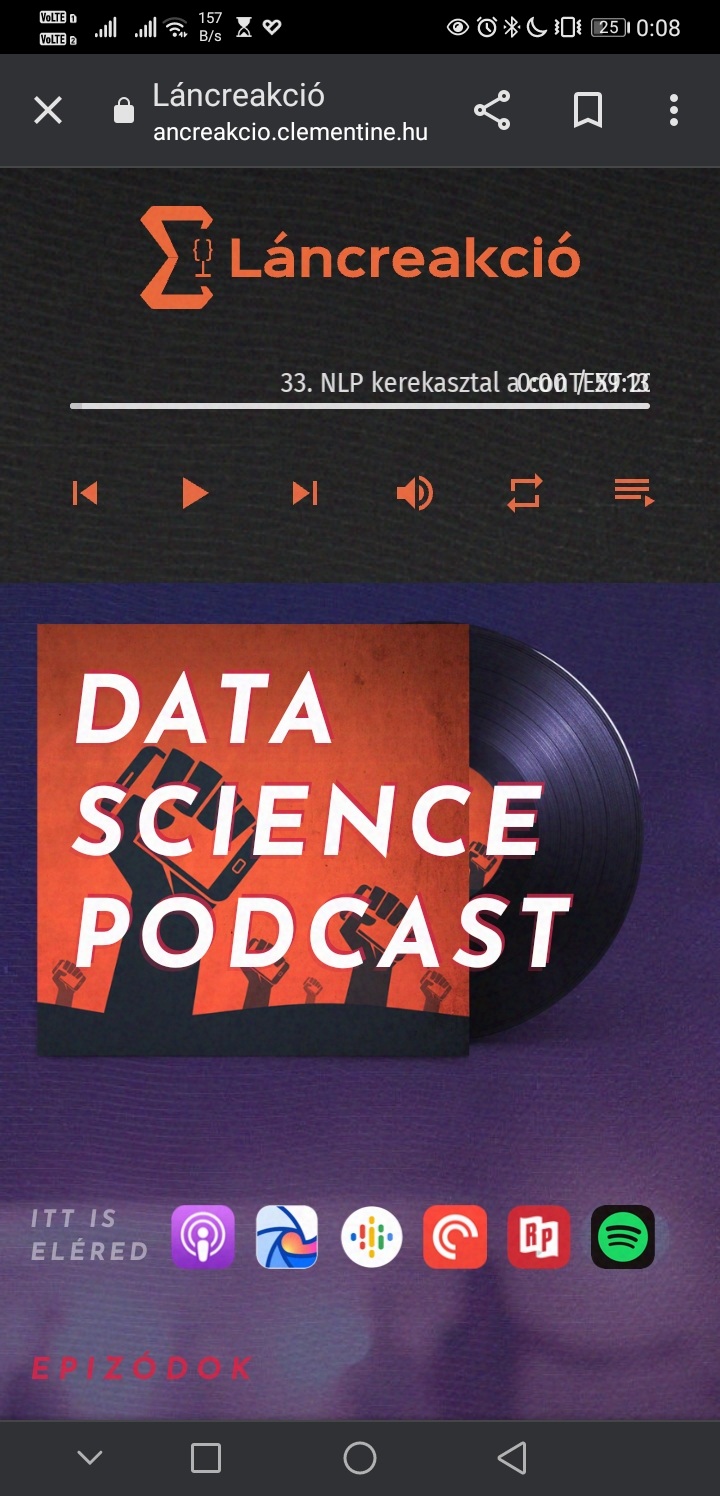 Helló Gyula, Szervusztok, Nem tudom ismeritek -e a mellékelt képen látható Podcast-ot. Adattudomanyi megoldáokat és esettanulmányokat beszélnek át. Üdvözlettel: Márfi Balázs +36702432512 Gyula Dörgő <gydorgo@gmail.com> ezt írta (időpont: 2021. nov. 18., Cs 21:27):